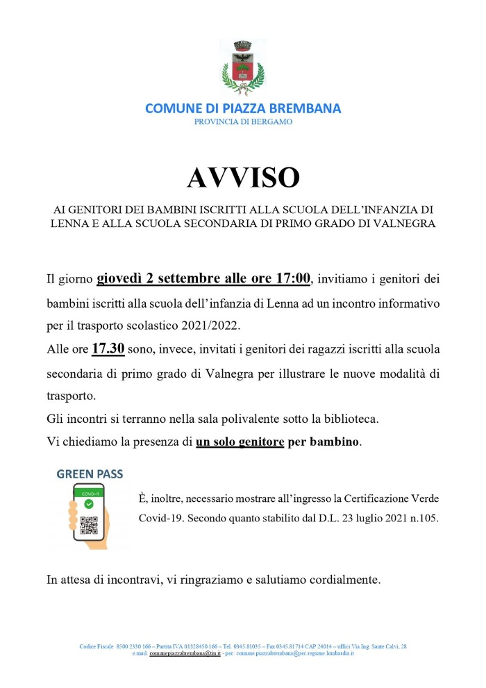 Per i genitori dei bambini iscritti alla scuola dell’infanzia di Lenna e alla scuola secondaria di primo grado di Valnegra.