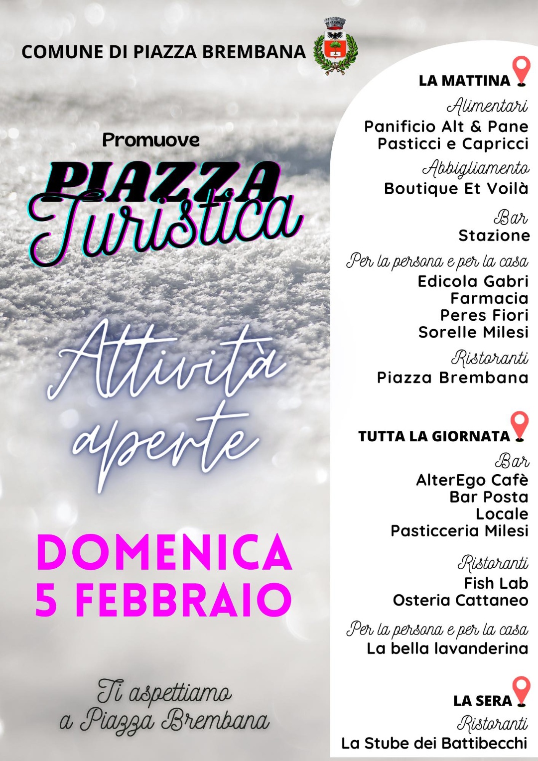 Da oggi il Comune di Piazza Brembana promuove “PIAZZA TURISTICA…”, una locandina che riporta le attività aperte sul nostro territorio nella giornata di domenica.